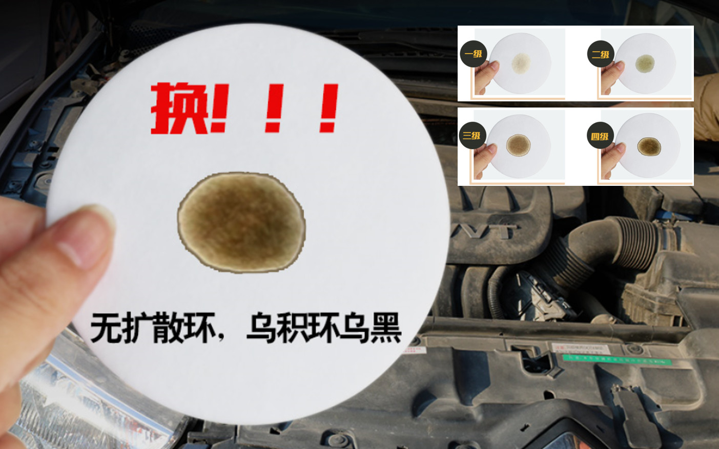 机油试纸使用方法:取出机油尺,往机油纸上滴几滴,静置一天等待机油完全扩散,然后进行观察。如果扩散的机油油环、沉淀环、扩散环之间的边缘越硬,则机油性能衰减就越厉害,根据不同油环可以判定出机油的现状。